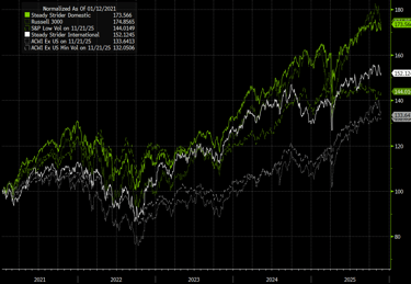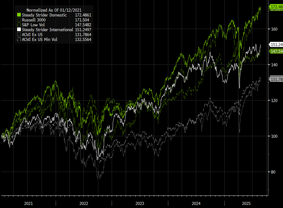 All performance is gross of fees. The paper portfolio performance is hypothetical and was calculated as follows: At portfolio inception, we uploaded paper portfolios onto Bloomberg’s “PORT” portfolio management system, and the software tracks daily total returns by calculating the total return of each security (using the prices on the Bloomberg system each day along with any dividends) and aggregating to the portfolio level. These daily returns are then chain linked to calculate the geometric monthly and annual returns shown here. At each quarterly rebalance date (typically on the weekend following the 12th of Feb, May, Aug, and Nov), a revised portfolio with the new rebalancing weights was added to the system, which was then used for the subsequent quarter. Although the returns reflect decisions made on the rebalancing dates and are not backtested, they are hypothetical and assume end of day prices based on Bloomberg's pricing that may not be truly executable (and cannot capture transaction costs and market impact). Because the performance is hypothetical, it does not comply with GIPS standards. Past performance is not indicative of future results. All investing is subject to risk, including the possible loss of the money you invest. Investments in stocks or bonds issued by non-U.S. companies are subject to risks including country/regional risk and currency risk. Investments could lose money over short or even long periods. You should expect your account value to fluctuate within a wide range, just as the overall stock market does. Your performance can be hurt if stock prices decline, including cyclical periods of falling prices. Investments in foreign stocks can be riskier than U.S. stock investments because they tend to be more volatile and less liquid. They are also subject to the risks of negative events in specific countries or regions. The factors underlying the specific strategies selected may experience long periods of underperformance, causing results to be less than expected. Additionally, poor security selection may cause underperformance relative to benchmarks or other funds with a similar investment objectives.